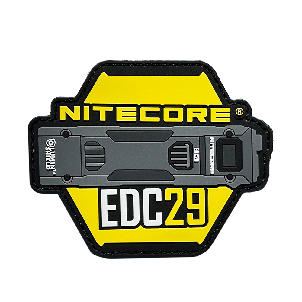 Nitecore gyári morale patch EDC29 taktikai elemlámpa grafikával. Igényes, részletesen kidolgozott PVC kivitel, a gyártó sárga színének megjelenítésével, melyen az EDC29 elemlámpa grafikája látható Nitecore felirattal.